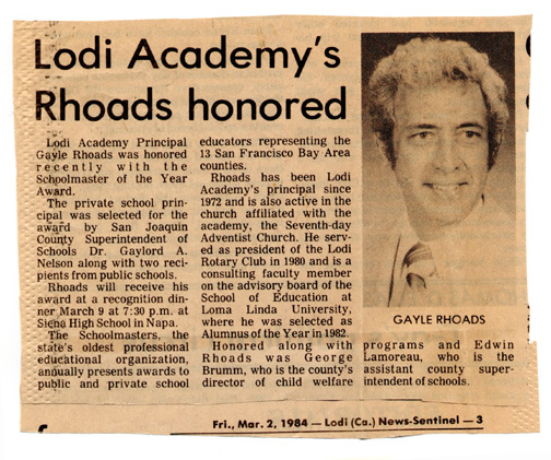 1949. In Keene, Gayle attends Southwestern Junior College Academy (then abbreviated "SWJCA," now Chisholm Trail Academy) as a junior. He works on the school's grounds. He meets Carlton Blackburn, (see interesting fn on Blackburn) who has returned from military service and now serves as SWJC's PE teacher and commanding officer of the Medical Cadet Corps (MCC) 1950. This spring, Gayle is a high school senior at SWJCA, and judging by the number of photos in the school's yearbook, a "big man on campus" who's involved in many extracurricular activities, singing above all. He also works for Carlton Blackburn as a reader, reports to him as his MCC Commander, and sings with him in a quartet. Despite the age difference of 18 years, the two enjoy a lifelong friendship. In the summer, Gayle graduates from high school in Keene, Texas. (He will attend junior college, SWJC, in the fall.) Gayle also meets Ray Herber at Keene, who becomes a close family friend and Gayle's physician later in life. 1950 is also the year that Gayle and his friend Sandy Clayton spend the summer tending the Klondike Ranch and hiking and camping along the Brazos river in Texas. As Texas has become his state, the Brazos becomes his river. Sandy and Gayle cut cedar posts and sell them "to buy beans," their summer camping fare. At one point they unknowingly pitch camp on Johnny B. Wright's land, who, cradling a shotgun, appears outside their pup tent. The tension doesn't last long; Wright befriends the two teenagers and shows them a whisky still on his land. (See SC's recollections here.) This year, Gayle also befriends Jim Singleterry and the notorious Wyoming boy William Crawford ("W.C.") Beeler (see "Beeler Dribbles"). Fred Speyer also becomes a close friend, traveling companion, and singing partner in a quartet with Carlton Blackburn and Roy Jones. They build a repertoire of about 80 songs and are in demand around the state. Here's a photo of Fred and Gayle on summer vacation in Colorado. (See the story, "Speyer Honks," and FS's recollections.) (fn) 1951. In July, Gayle is chosen as a delegate from SWJC to the World Congress of SDA Youth, held in Paris, France. He flies to Paris on a Lockheed Constellation and sails from Europe aboard the Dutch ship Volendam. Gayle is also elected Student Association president this year. (fn) 1952. This summer, Gayle graduates from SWJC in Keene, Texas. (He will transfer to Union College in Lincoln, Nebraska as a junior.) Since Gayle is moving back to Lincoln, he writes a letter to his old boss, Frank Woods Sr, asking if any work is available at the mansion. Gayle is unaware that Frank Sr. has recently died. As Frank Jr. is sorting through his father's estate, he finds Gayle's open letter on his father's desk. So Frank Jr. hires Gayle to become the caretaker at the empty mansion while it is for sale. The mansion does not sell for a very long time, providing Gayle with both a job and a swank off-campus residence. He lives in a room over the large garage. Gayle's friend Speyer also rooms at the mansion in 1954---there were plenty of rooms--23 of them, to be exact. (fn) 1953. BJ Lenz rooms with a girl that year who has a large picture of Gayle on her desk. This is BJ's first visual of Gayle. (I know what you're thinking, but Gayle and the girl stop dating of their own accord.) The following semester, BJ is late to the first day of an English class. There's one seat left in the room, next to Gayle. Weeks later, Gayle spots BJ, who is splashing around in a puddle, barefoot. He asks her for a date. Months later, Gayle proposes to BJ in the third floor of the Woods mansion. They get in trouble with the school for staying out too late that night. Here are two photos of Gayle & his car from '53. (fn) 1954. B.J. Lenz graduates with her B.A. in English from Union College in May; she minors in home ec, biology, and education. 1955. In the fall, Gayle and BJ meet Ron Christensen. Gayle is serving his second ministerial internship at the Houston Central Church in Houston, Texas. Ron comes to the church expecting a Friday night meeting and finds only Gayle and BJ working in the church office. Ron becomes a frequent dinner guest at the Rhoads house, and close friend. See "Gayle Quibbles" for a fun story involving Ron. 1955-6. Gayle discovers canoeing. Much later in life, he started a computer file called "Early Canoe Memories," and it contained this one sentence: "I was driving west on Law street when my eyes fell on a green canoe parked in a front yard, a strange sight for a yard in Houston Texas." But the rest of the story is here and in the footnote: 1956 is also the year that Gayle starts his third ministerial internship in Tyler, Texas. While in Tyler, Gayle is ordained as a minister of the SDA church during the summer of 1957. 1957. Gayle is given responsibility for a ministerial district in McCook, Nebraska. Around this time he is finishing a project: he's laboriously typing out scores of pages of sermon notes and assembling them into a thick 5-ring binder. As is a minister's duty, he is searching for, and cataloging, sermon material and counsel to give to church members. Thoughout his life he collects prayers. He will follow the advice of paragraph #2 on this page in another year or two. (fn) 1958. Gayle and BJ move from Tyler, Texas to the tiny town of Enders, Nebraska. While serving as the local minister in McCook, Gayle is asked to teach some Bible classes at Platte Valley Academy (aerial photo). This is the beginning of a career change, and 39 years of subsequent service in Christian education. (fn) 1959. Gayle and BJ move a little over 100 miles east to Shelton, Nebraska, where Platte Valley Academy is located. Gayle becomes the pastor of the Academy church in September and teaches religion courses. He gains a reputation as a creative teacher with some unconventional methods. Gayle is also the school's MCC Captain, and with his friend Don Weatherall, has adventures in the wildlands of the midwe